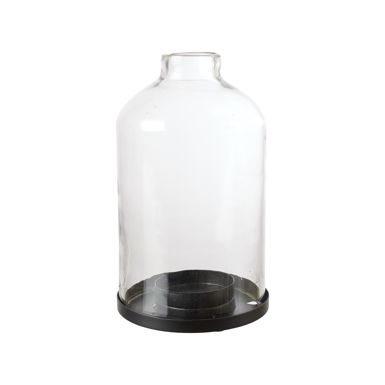 Vacker ljuslykta för värmeljus eller små blockljus i munblåst glas med fat av svart metall.